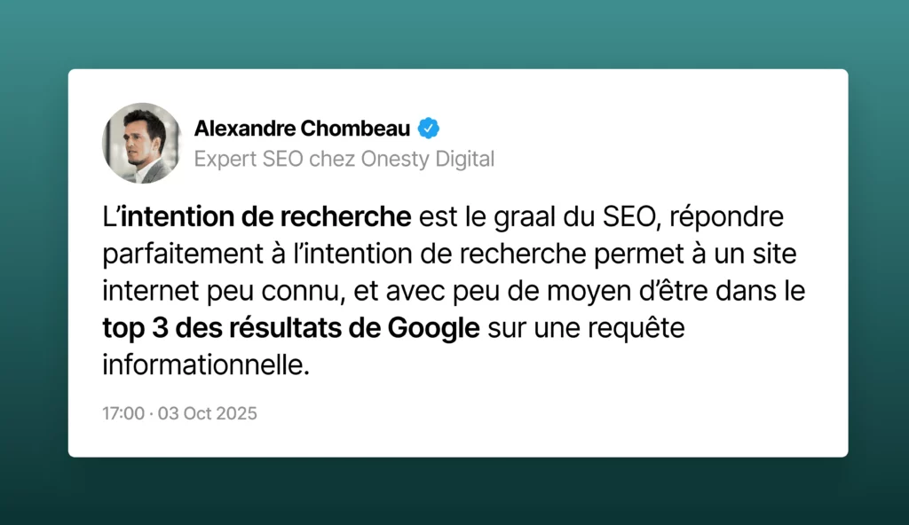 « L’intention de recherche est le graal du SEO, répondre parfaitement à l’intention de recherche permet à un site internet peu connu, et avec peu de moyen d’être dans le top 3 des résultats de Google sur une requête informationnelle » – Alexandre Chombeau, Expert SEO chez Onesty Digital
