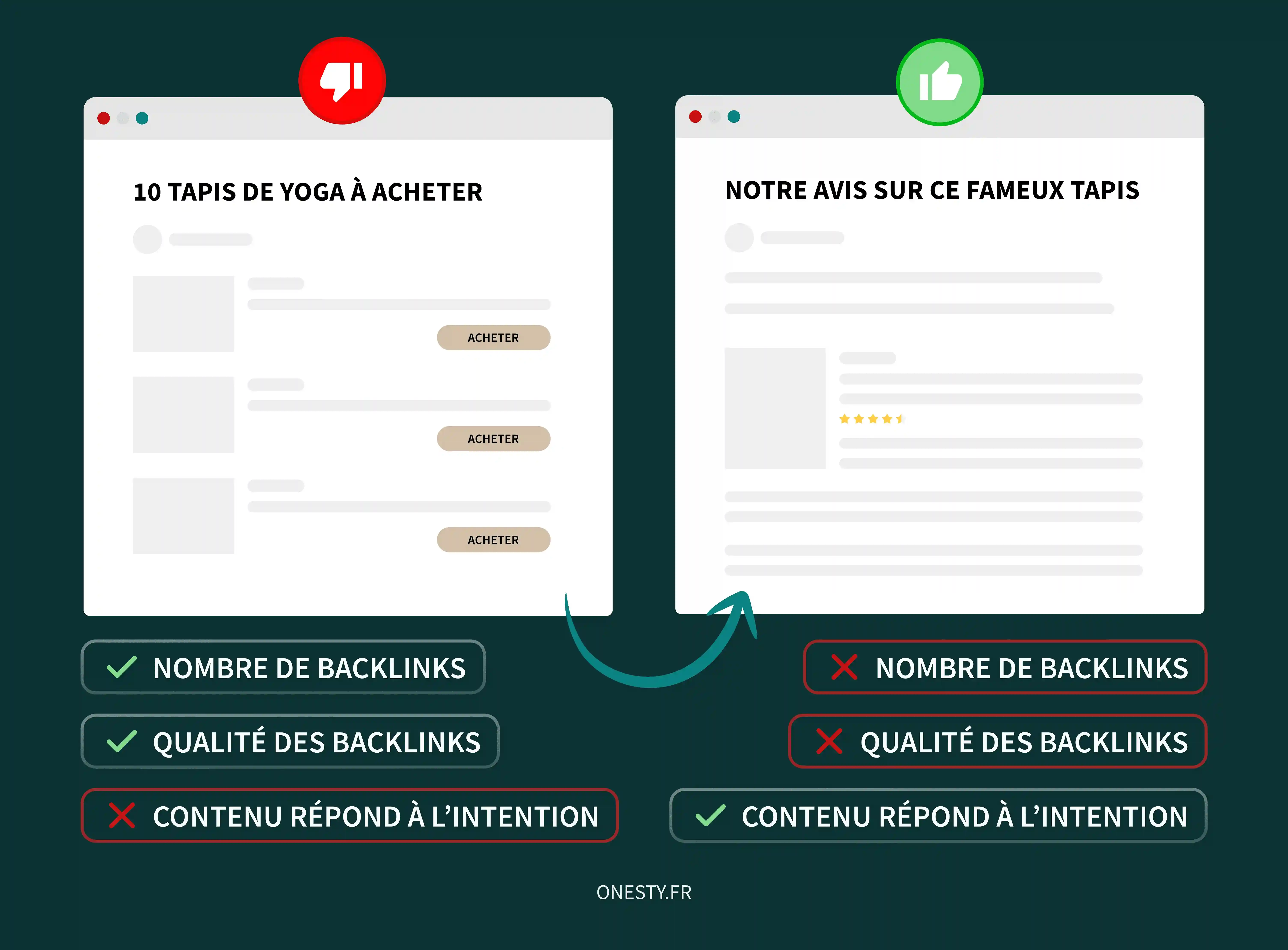 | Tapis de yoga | Page e-commerce listant des produits | Comparatif / guide « meilleur tapis » | Page produit invisible, le guide attire tout le trafic |