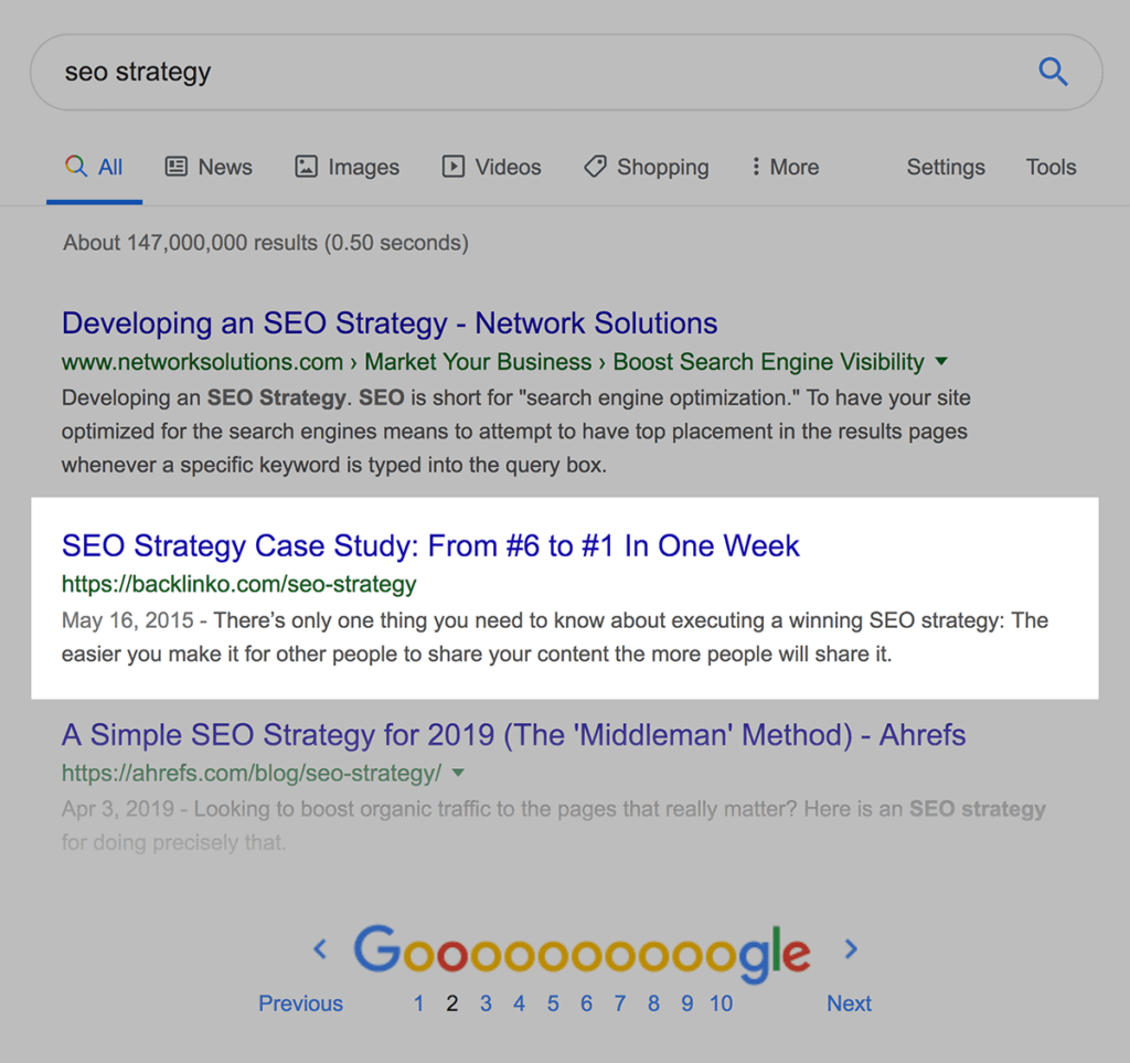 Prenons un cas concret : l’Expert SEO Brian Dean a raconté comment l’un de ses articles, pourtant très qualitatif et riche en informations, stagnait en page 2 de Google sur la requête « SEO strategy ».
