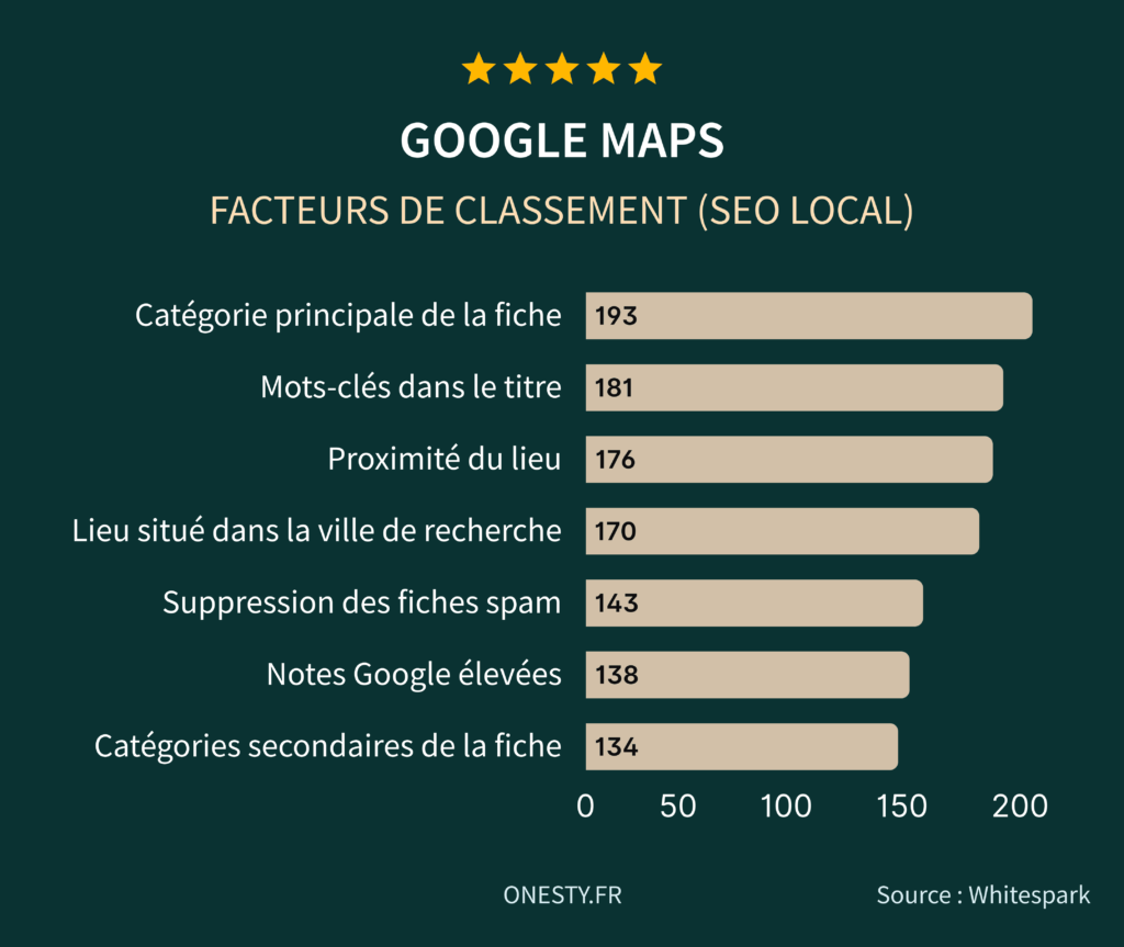 Une étude récente de Whitespark (2021) a identifié la catégorie principale comme le facteur n°1 de référencement local sur Google Maps (Google Business Profil) devant tous les autres critères. Cette même étude indique qu’une mauvaise catégorie principale est le facteur qui impactera le plus négativement votre positionnement.