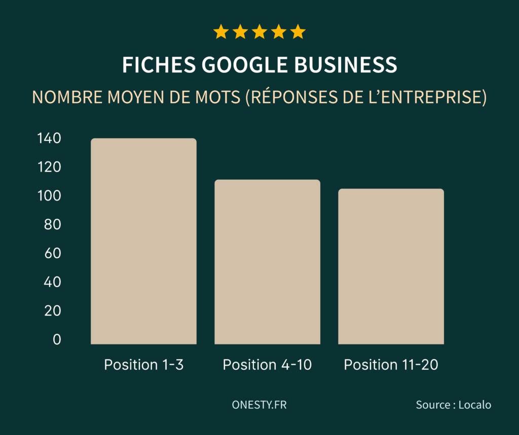 L’étude révèle que les entreprises qui répondent à leurs avis avec une moyenne d’environ 140 mots par réponse figurent généralement dans le top 3 des résultats Google.